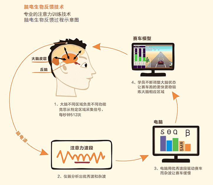 注意力分散的人群,他们的脑神经往往不能在较枯燥的环境下恰当地分泌和吸收多巴胺。比如:网络游戏上瘾的人群往往依靠网络游戏带来的高度刺激获得注意力集中。一旦他们的刺激环境降低,如较枯燥的学习课程和工作,则容易犯困,大脑无法在低刺激环境分泌多巴胺,从而导致无法集中注意力学习。长期暴露在高刺激的网络游戏上,则越来越难以在日常生活简单任务上集中注意力。多巴胺分泌过少则无法集中注意力,大脑产生过多α和θ波。多巴胺分泌过多,则 过度焦虑,大脑释放高β波。 竞思领航星通过脑神经产生的电波找出每个人集中注意力时的波段SMR和低β波,通过实时训练,提高注意力区间有效波长。脑神经细胞逐渐习惯在枯燥的环境下产生适量的多巴胺。与此同时通过训练抑制注意力不集中和过度焦虑,较后大脑养成用脑习惯,达到显著提高注意力和学习工作效率的效果。